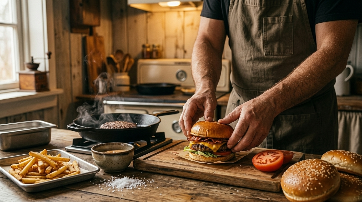 Hâlâ her burgeri aynı titizlikle hazırlıyoruz: taze malzeme, doğru pişirim, sade ve net lezzet. Süsleme değil, tadı öne çıkaran tarifler.